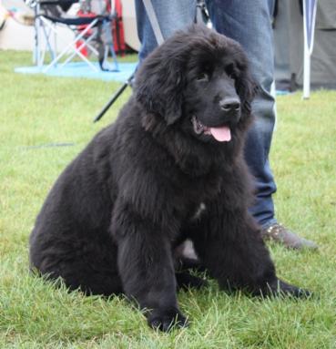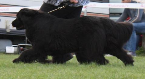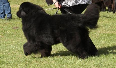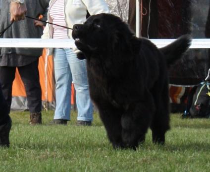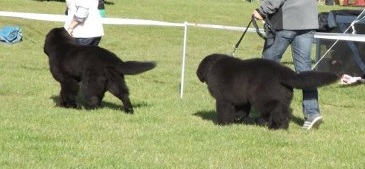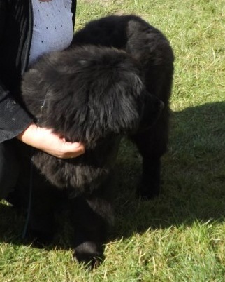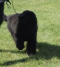Vorgestellt wird eine 5 ½ Monate alte schwarze Hündin, sehr guter femininer Hündinnenkopf, gut geschnittene dkl. braune Augen, Scherengebiss, für das Alter schon gute Außenlinien und sehr gute Winkelungen, das Gangwerk zeigt sich für das Alter ohne Beanstandung, gepflegtes reichliche Babyfell, liebes freundliches Wesen, gut präsentiert. |